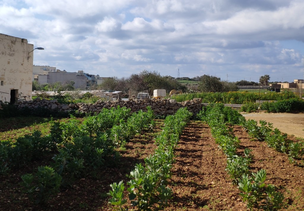 March – neat rows of broad beans in a nearby field