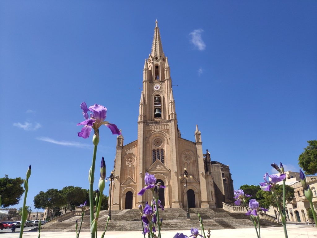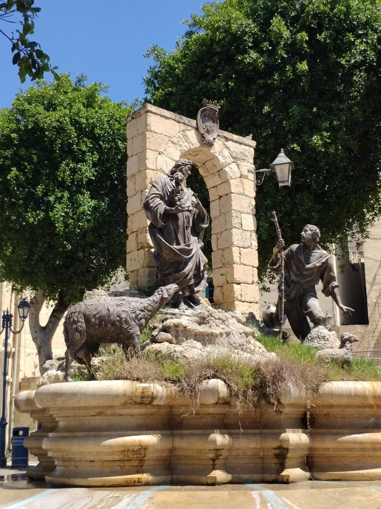 April – Pjazza tad-Dehra in the village. The statues celebrate the sighting of a holy apparition at this place, which appeared to a local shepherd.